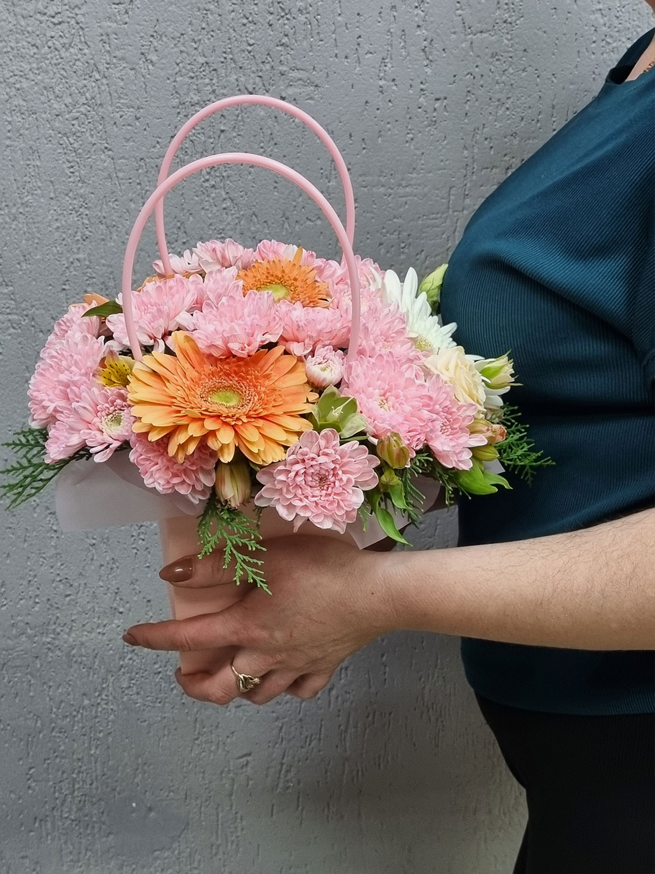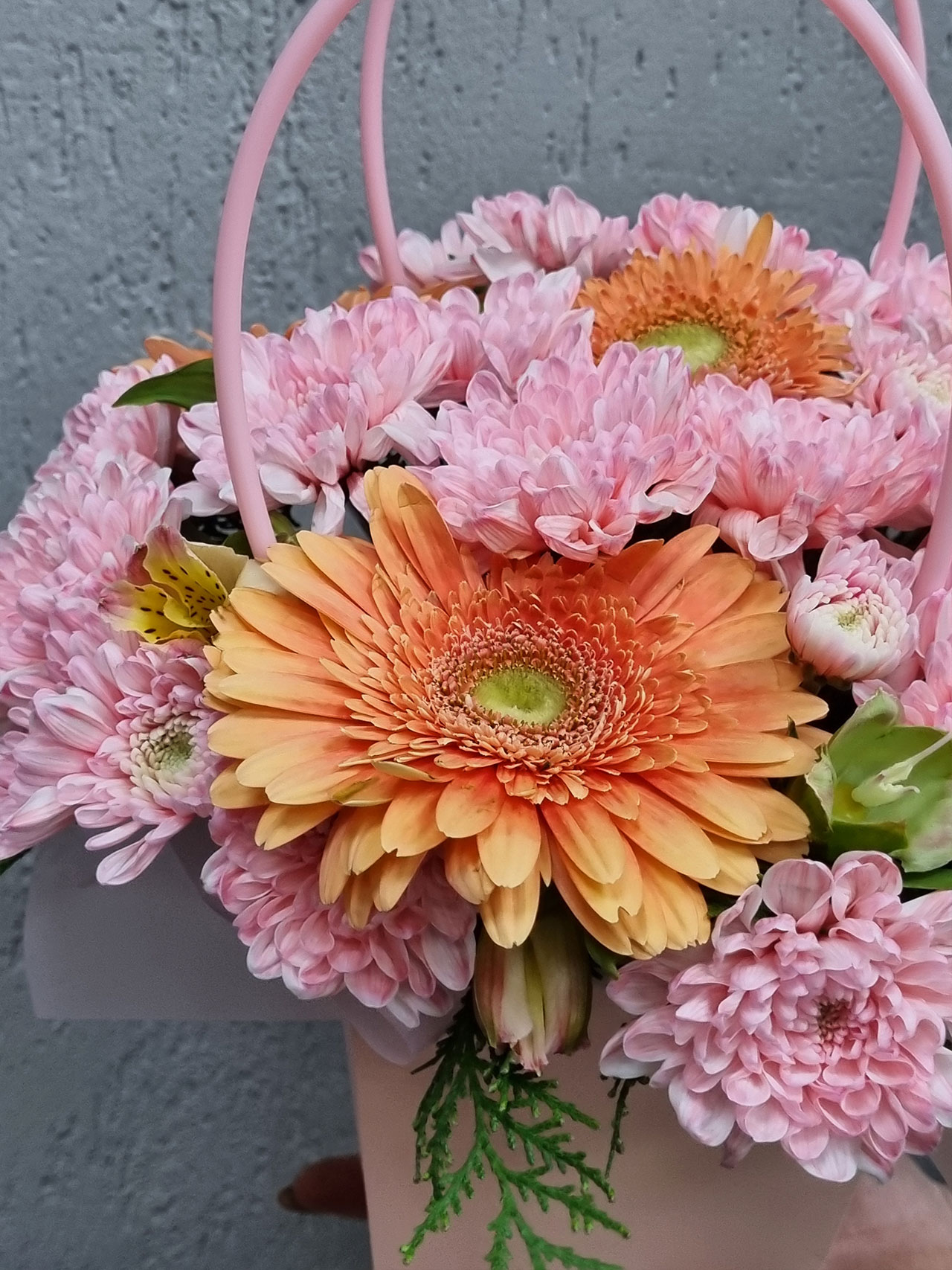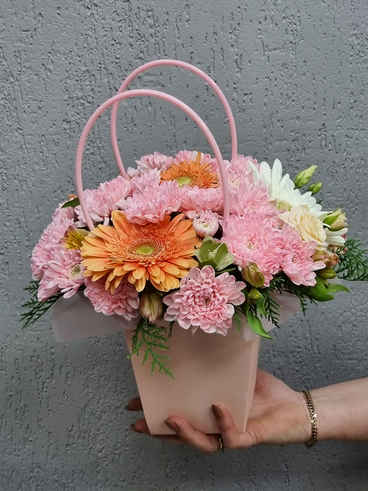 В состав букета входят кустовые хризантемы, символизирующие дружбу и искренность, герберы, которые олицетворяют радость и позитив, и альстромерии, несущие в себе обещание любви и преданности. Вместе они создают гармоничную композицию, которая не только радует глаз, но и поднимает настроение.