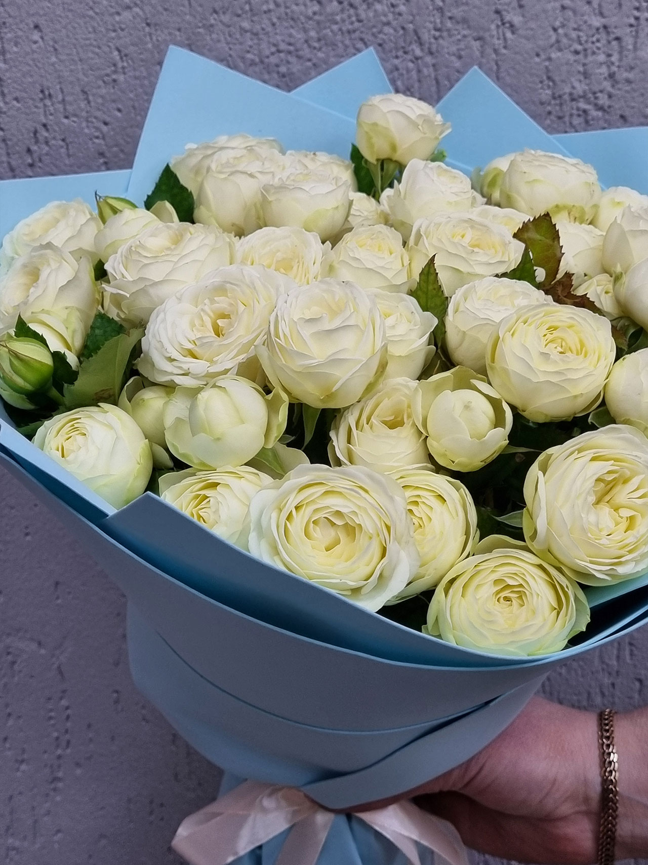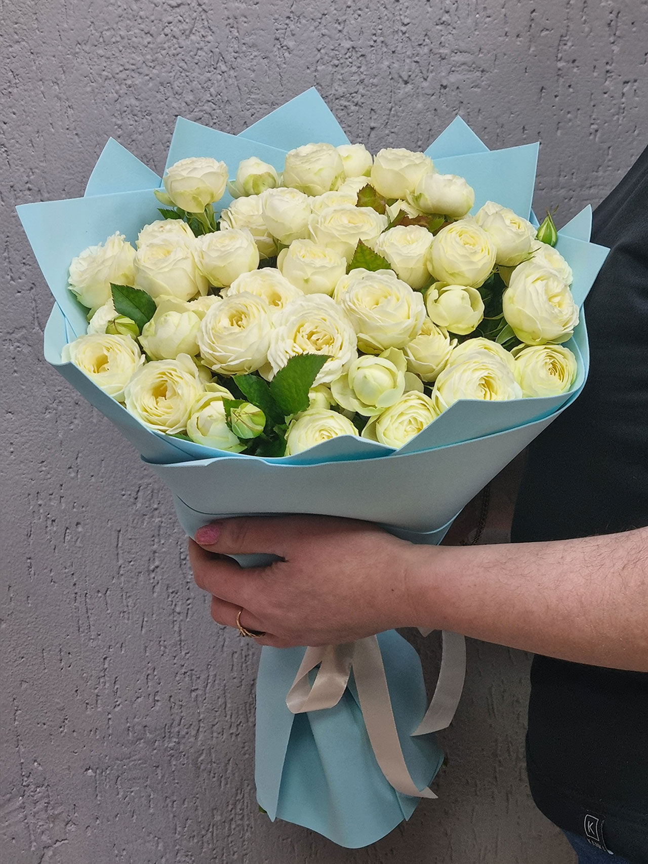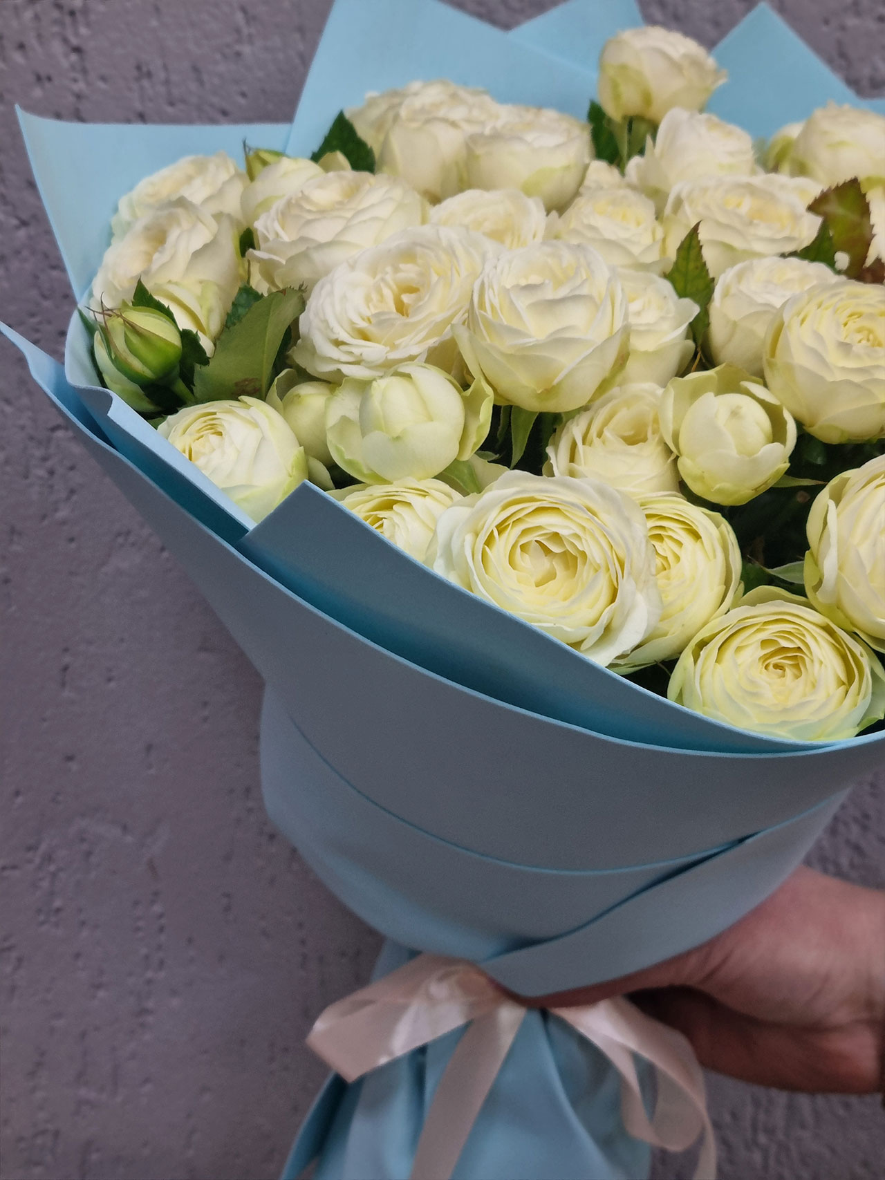 Нежные кустовые пионовидные розы, словно воплощение искренних чувств, создают композицию, от которой замирает сердце. Их изысканная форма и глубина оттенков рассказывают историю, понятную каждому.