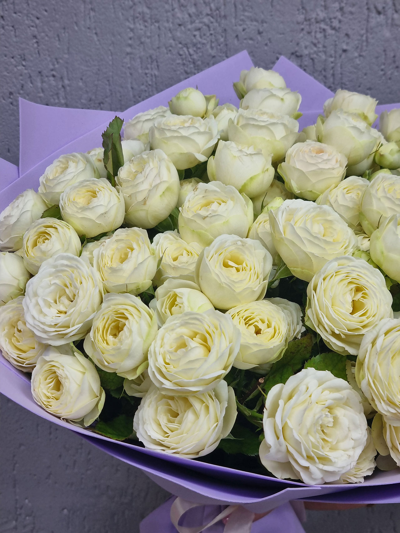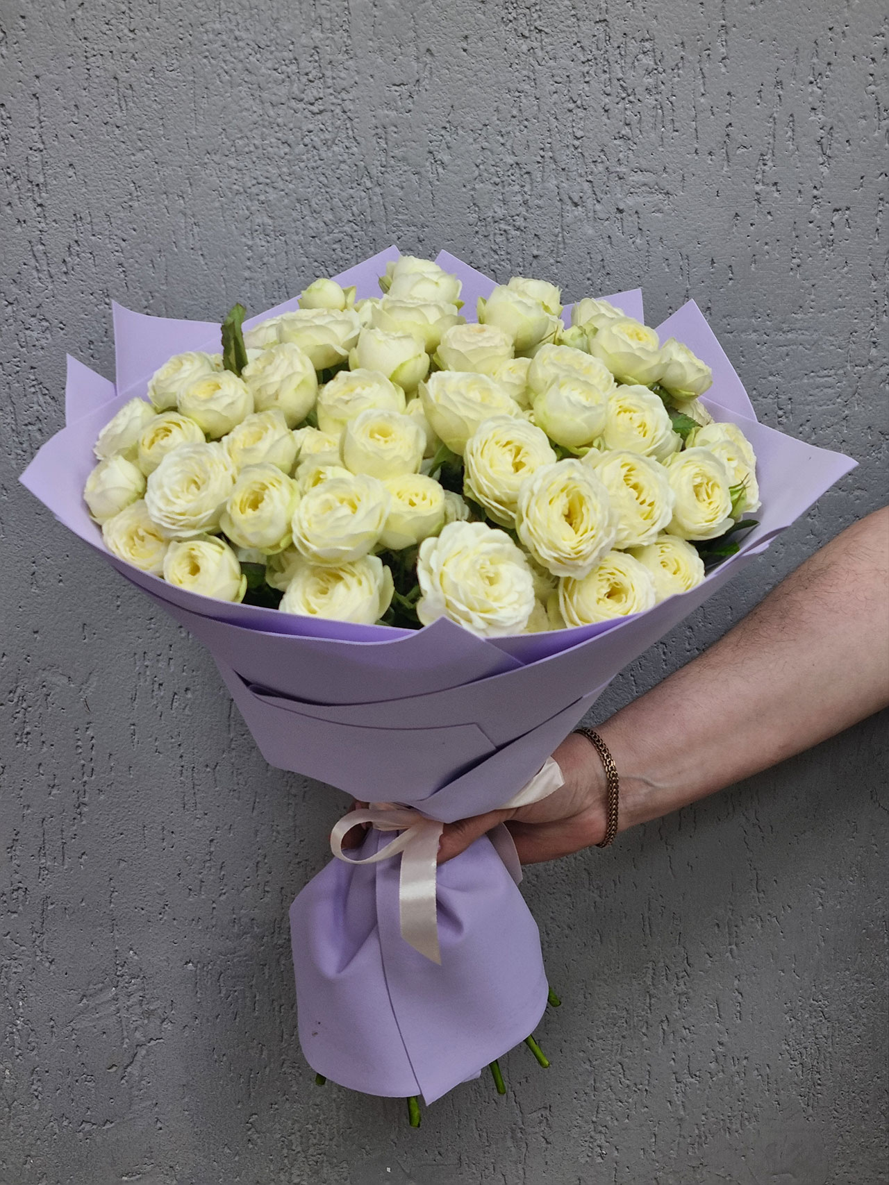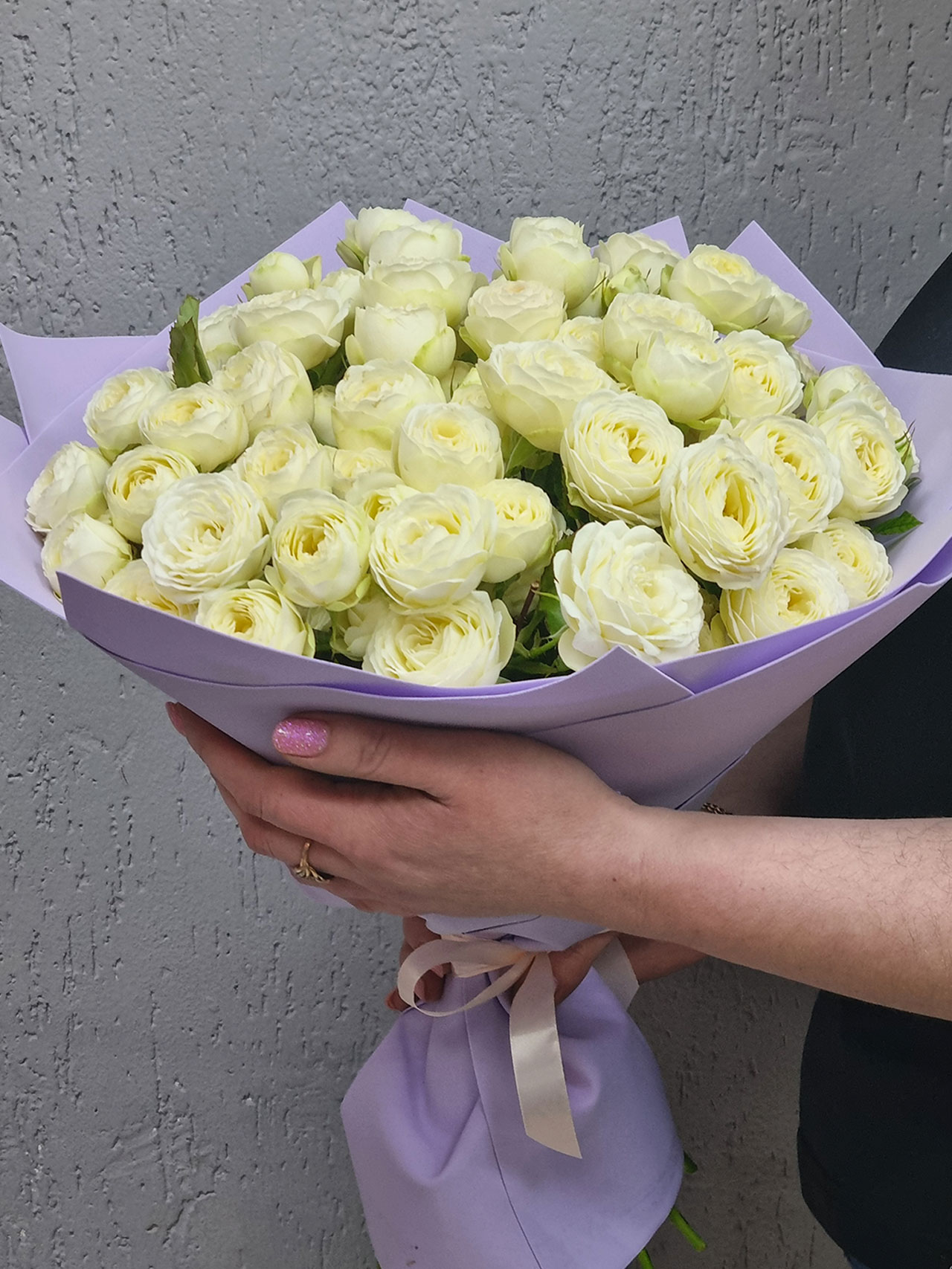 Нежные кустовые пионовидные розы, словно застывшие капли утренней росы, создают завораживающую игру оттенков. Каждая роза — маленькое чудо, обещающее бесконечность романтических мгновений.