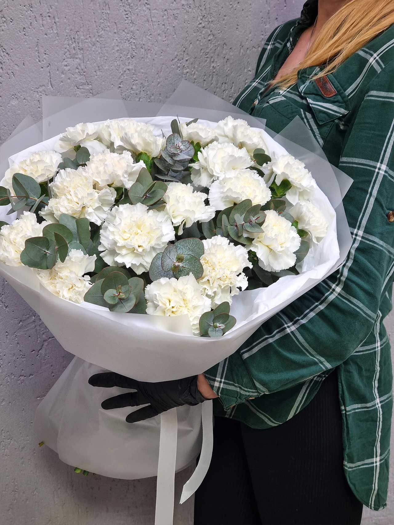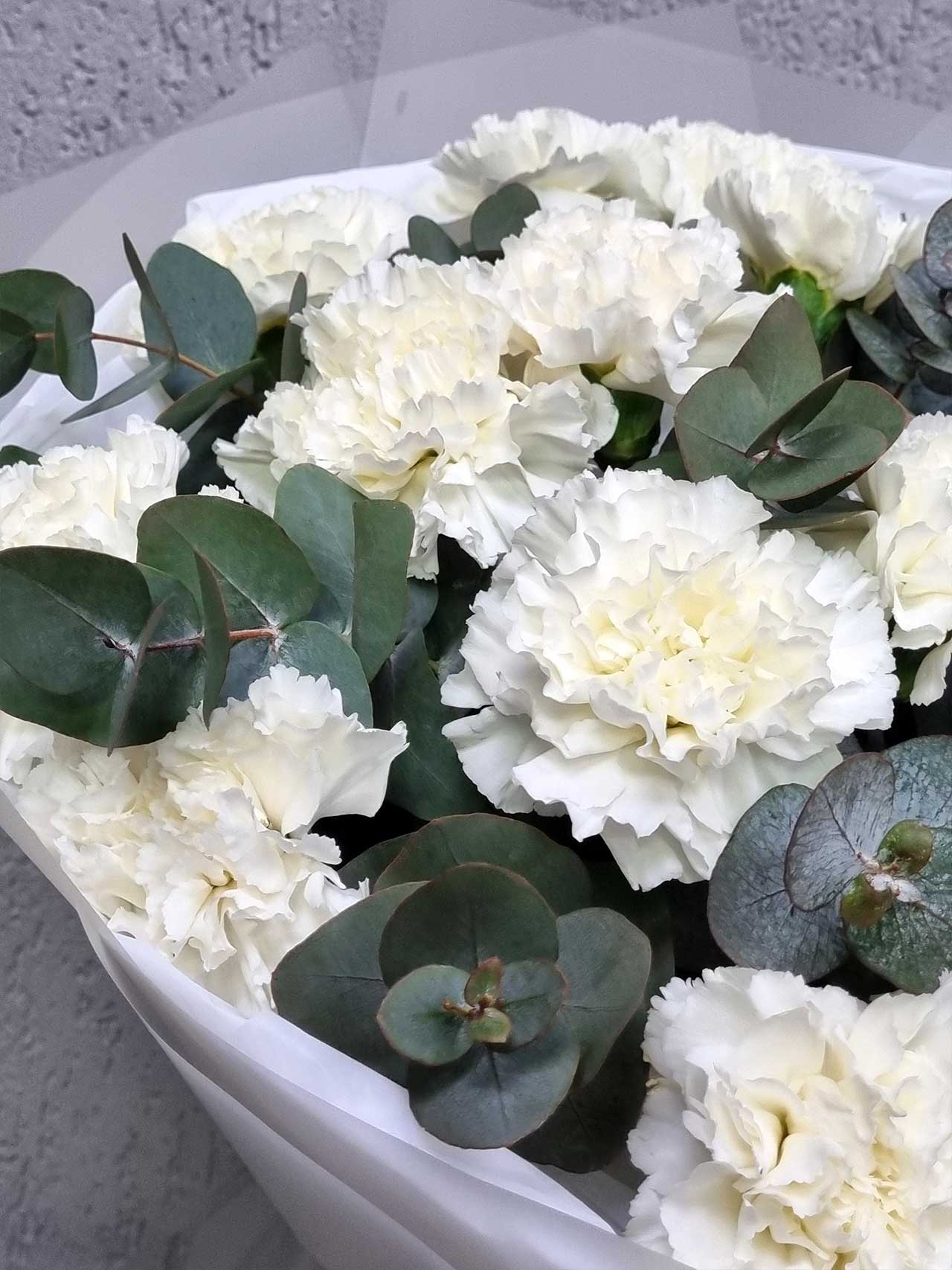 Пышные одноголовые гвоздики в сочетании с благородным эвкалиптом создают гармоничный и стойкий ансамбль, который будет радовать получателя очень долго.