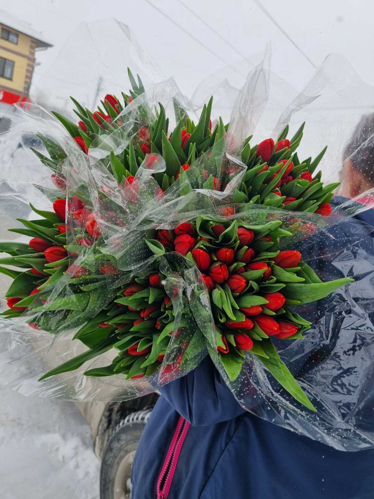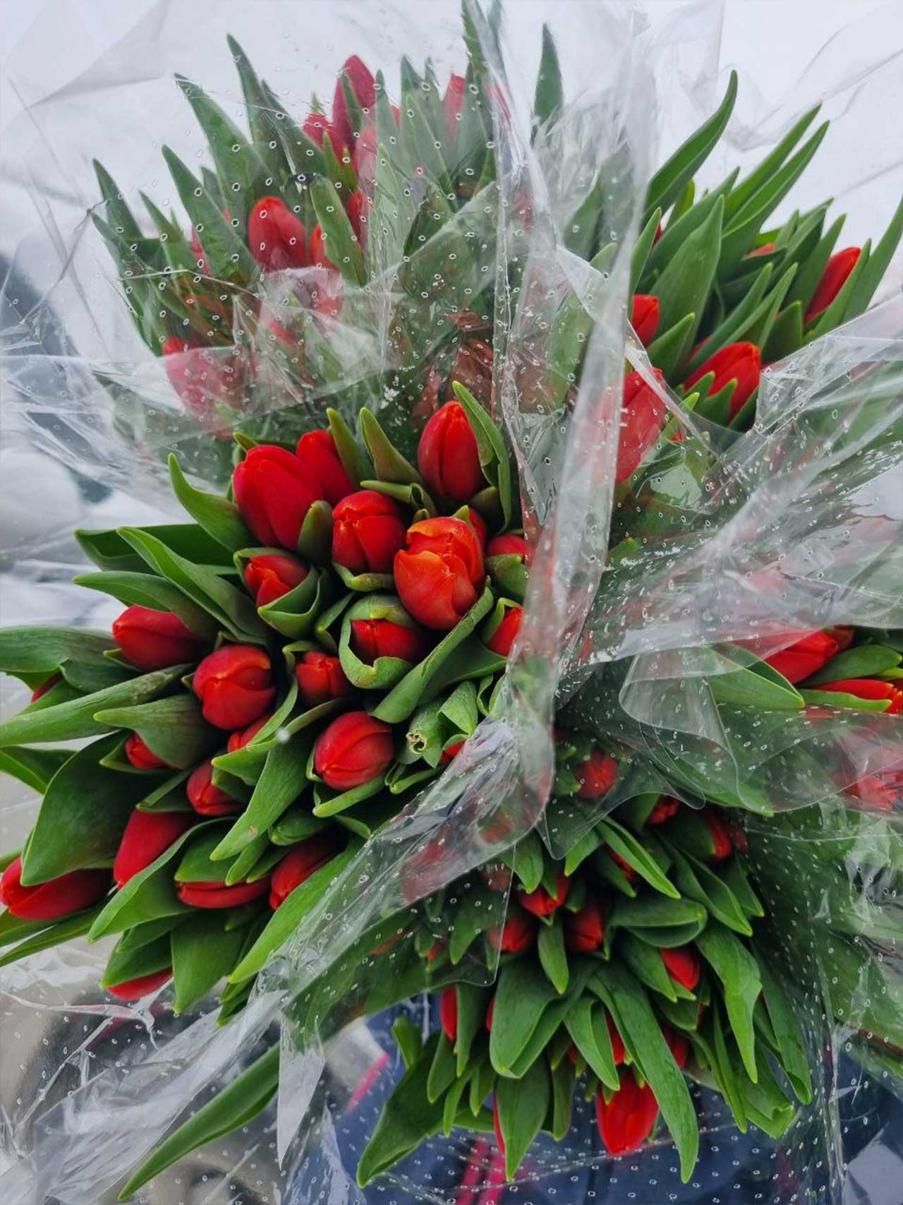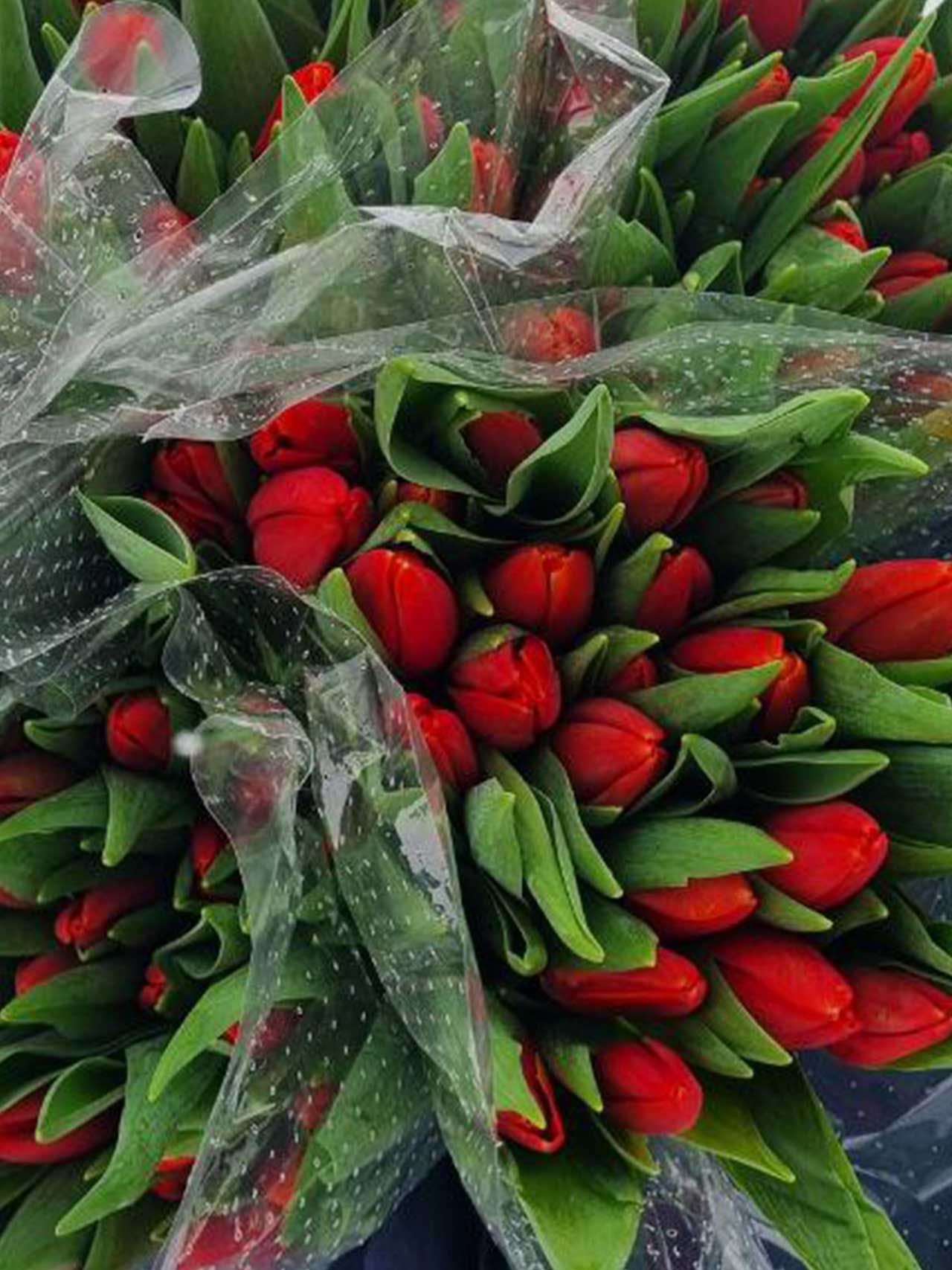 Красные тюльпаны - 25 шт. в транспортировочной упаковке: удобно везти, легко хранить, идеально для подарка и оформления.
