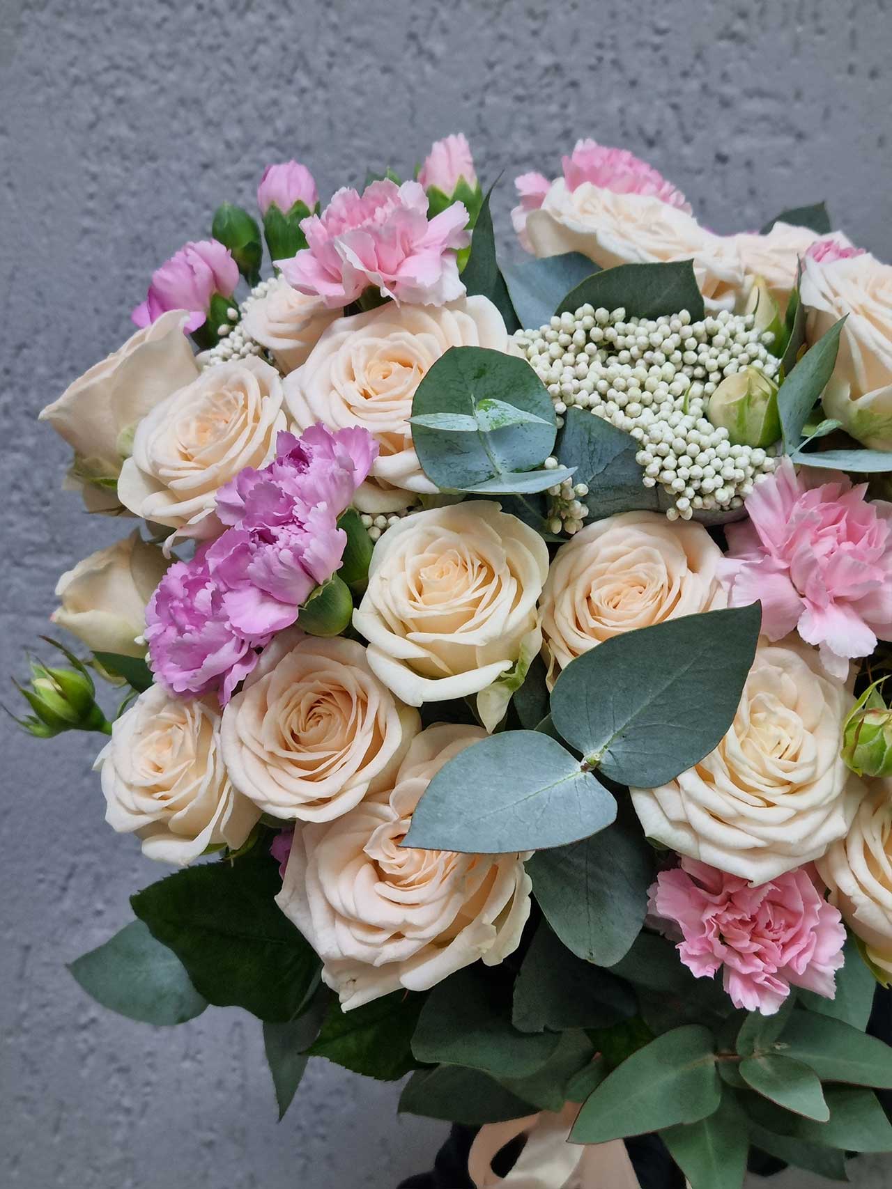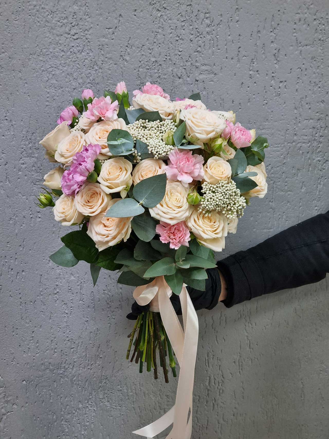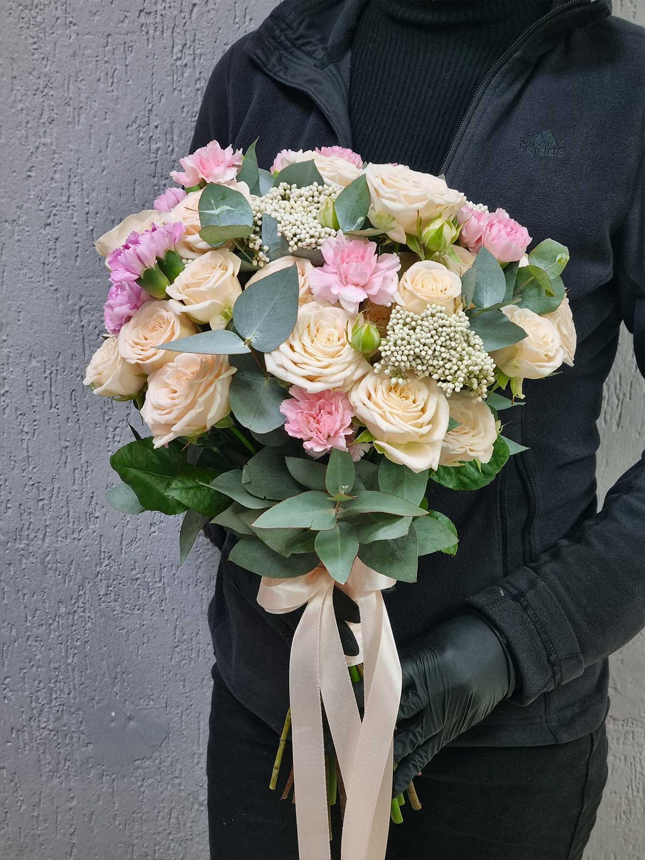 Погрузитесь в мир романтики с букетом "Афродита". Названный в честь греческой богини любви, он сочетает в себе кустовые розы, гвоздики, озатамнус и эвкалипт — каждый цветок символизирует страсть, нежность и гармонию. Лента атласная придает композиции элегантности и изысканности.