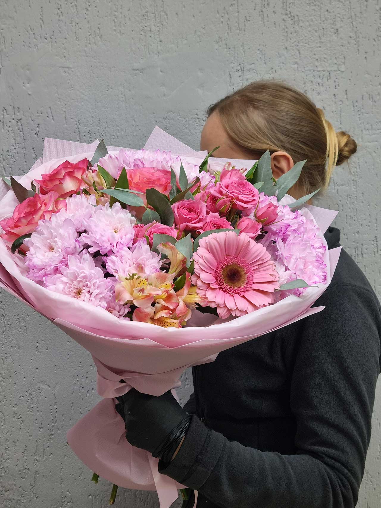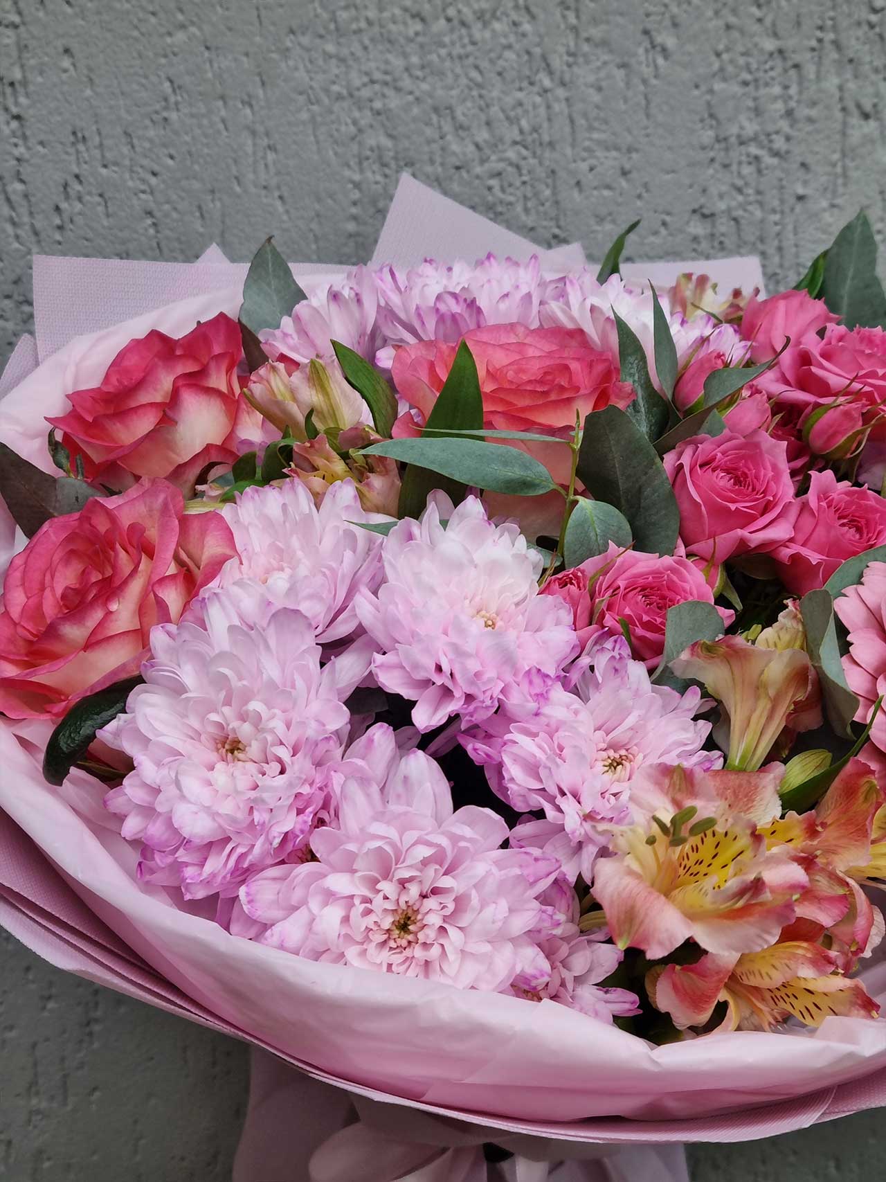 Каждый цветок рассказывает свою историю: роза — это вечная любовь, альстромерия — верная дружба, а эвкалипт добавляет свежесть и легкость. Такой букет станет идеальным подарком для романтического свидания, юбилея или просто как знак внимания для близкого человека. Оформленный в матовую пленку и обвязанный атласной лентой, он выглядит стильно и элегантно.