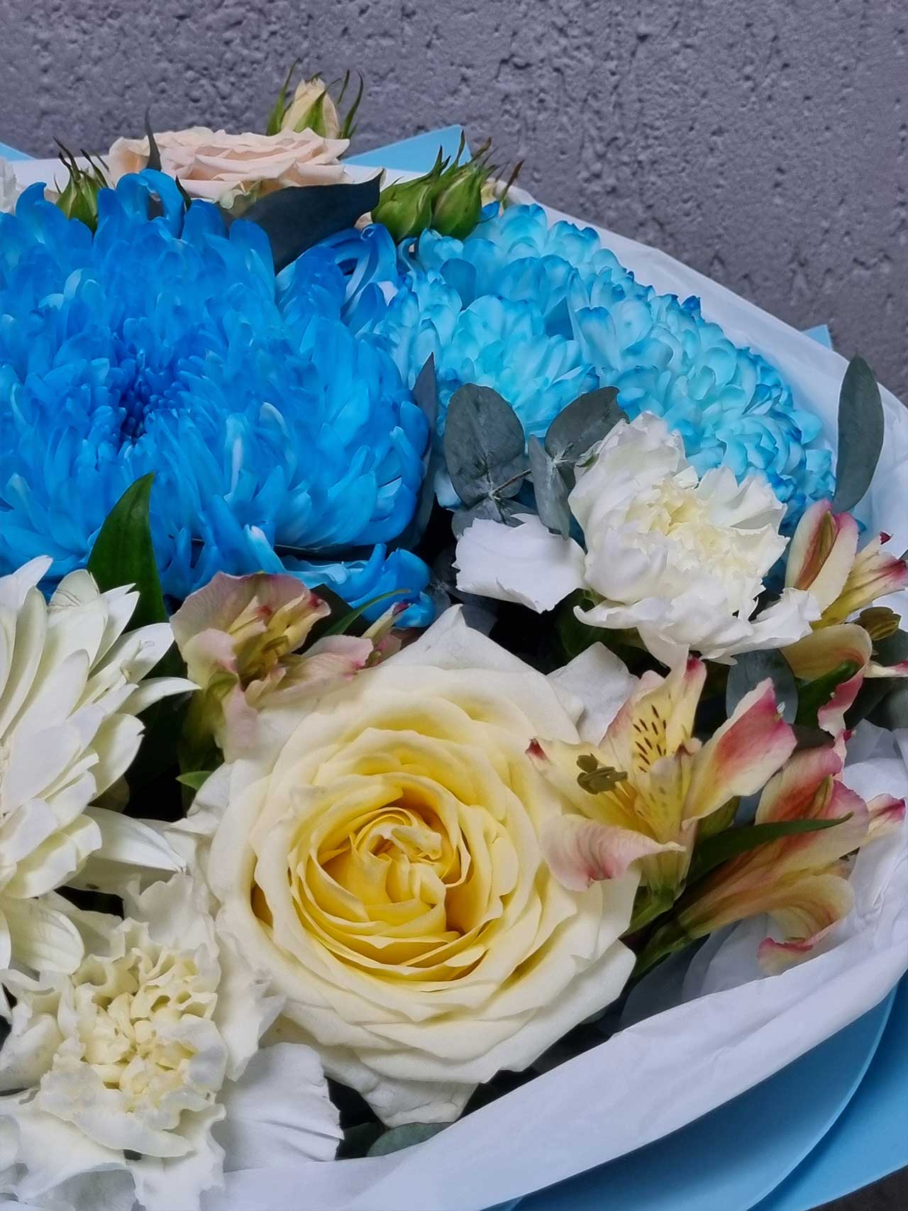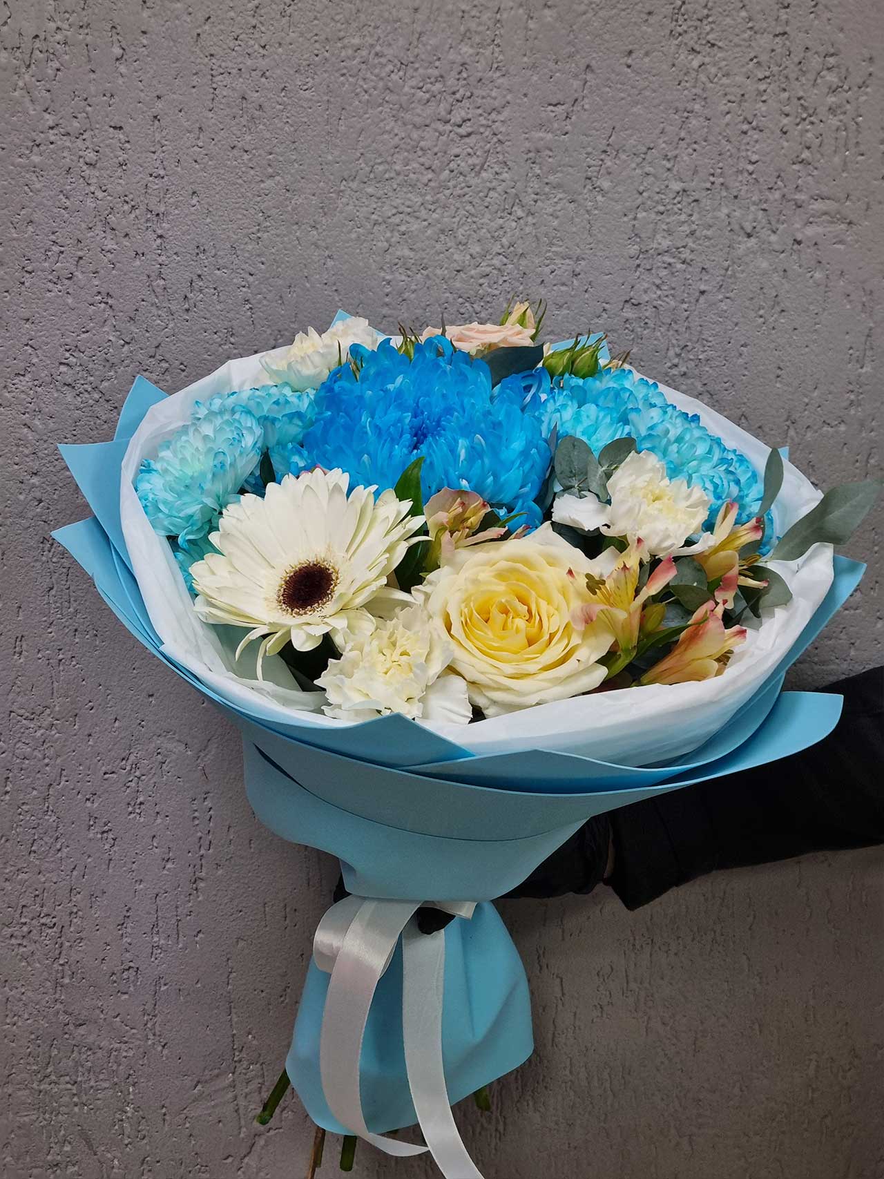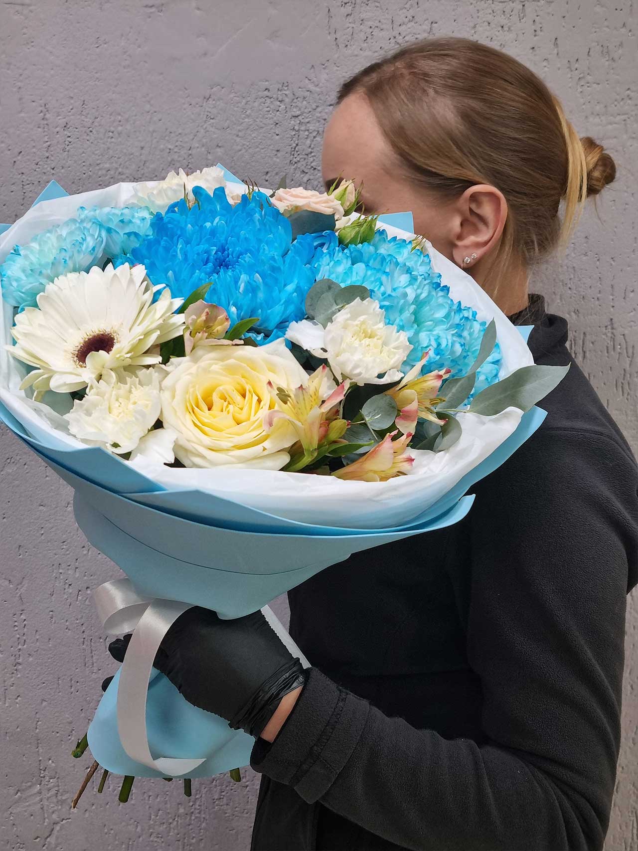 Состав букета включает кустовые розы, альстромерию, эвкалипт, кустовые хризантемы, герберы и одноголовую гвоздику. Каждый цветок рассказывает свою историю: роза символизирует любовь, альстромерия — дружбу, а эвкалипт добавляет свежести и гармонии.