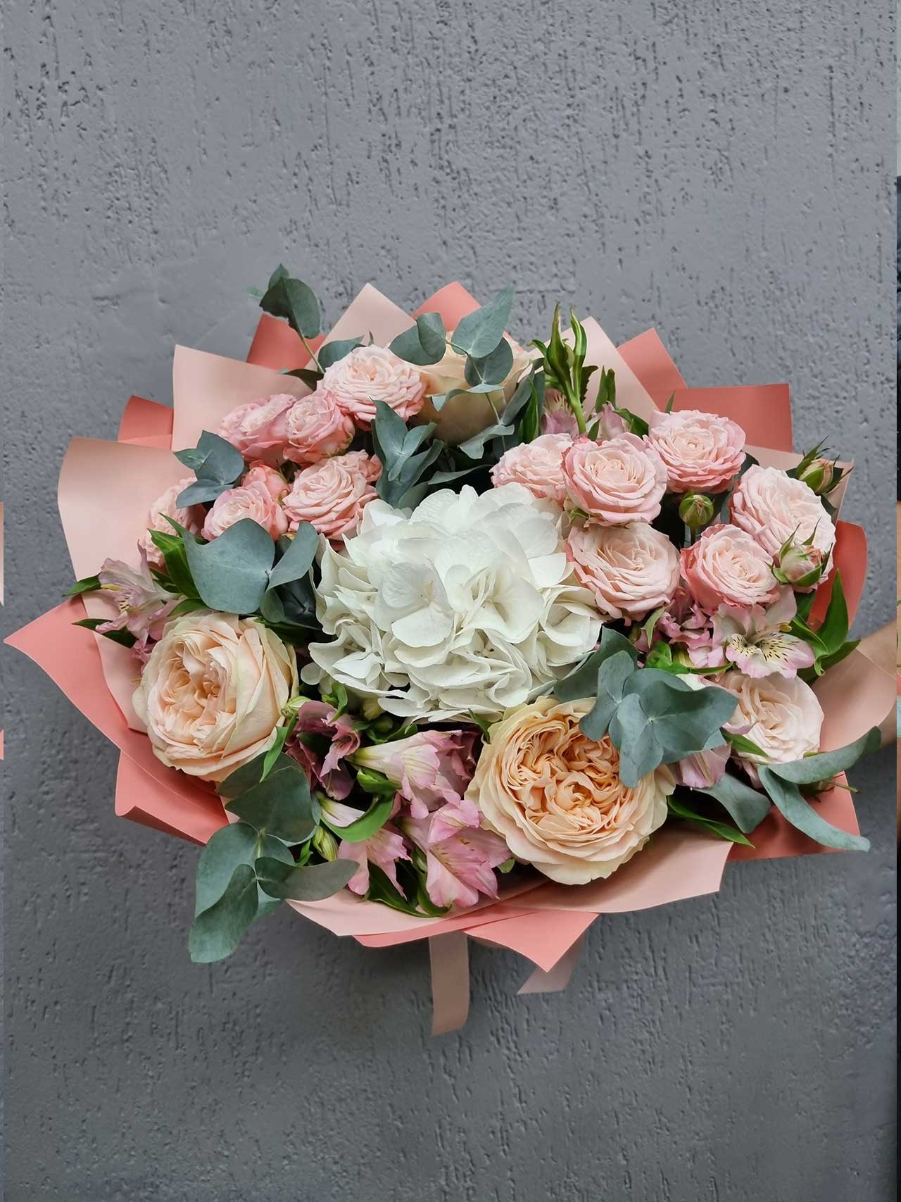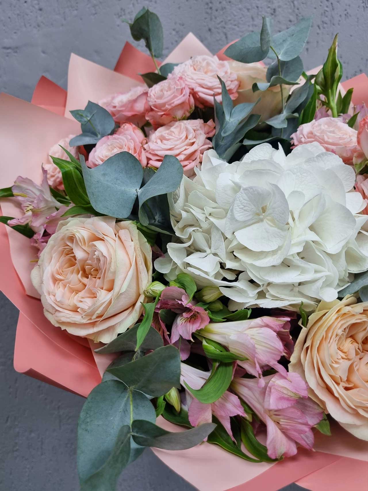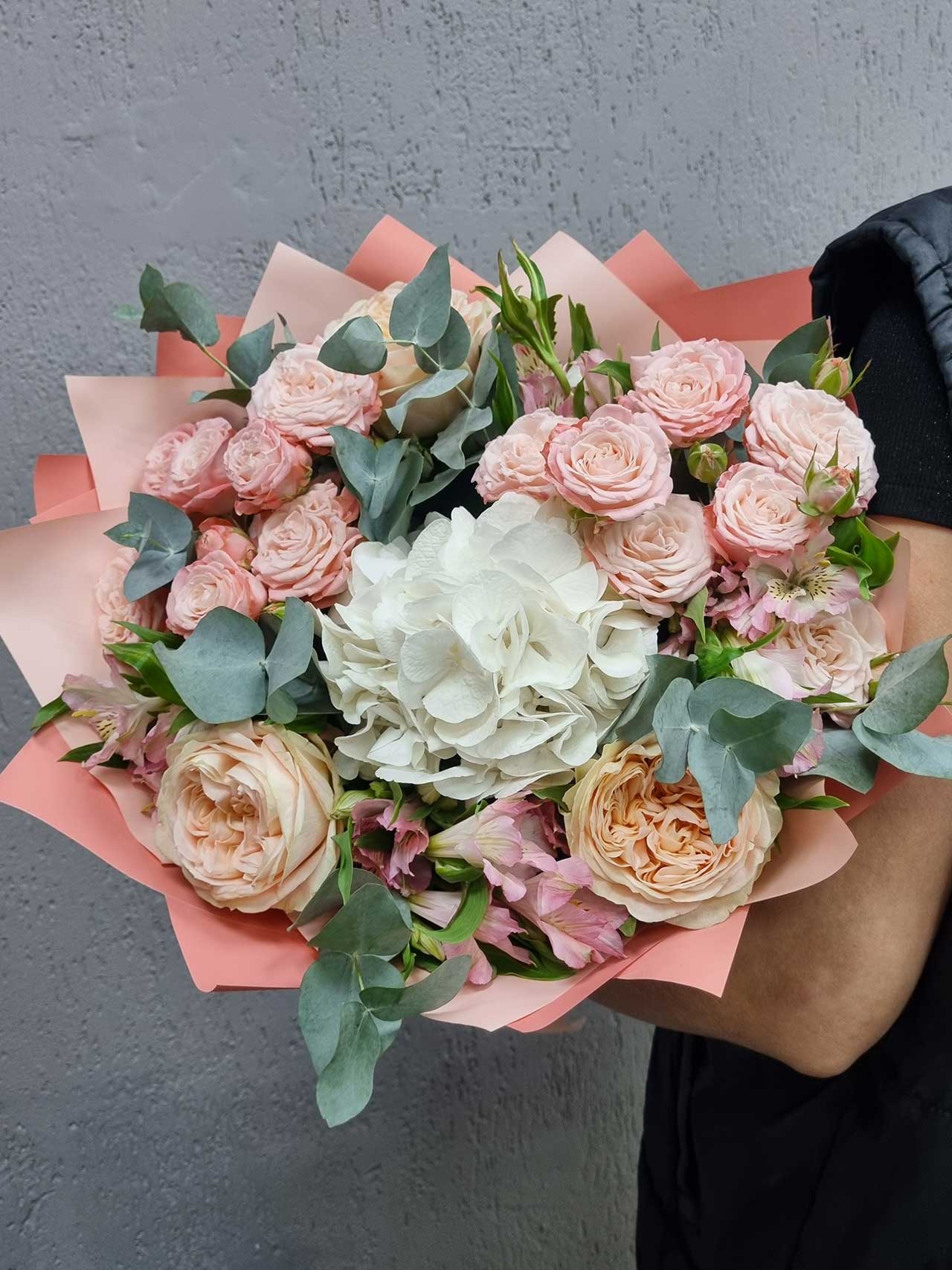 Гортензия, символизирующая благодарность и искренность, и альстромерия, олицетворяющая дружбу и преданность, создают идеальный тандем. Пионовидные розы, известные своим волшебным ароматом и великолепием, добавляют нотку романтики, а эвкалипт придаёт композиции свежесть и оригинальность. Этот букет словно создан для того, чтобы околдовать и пленить.