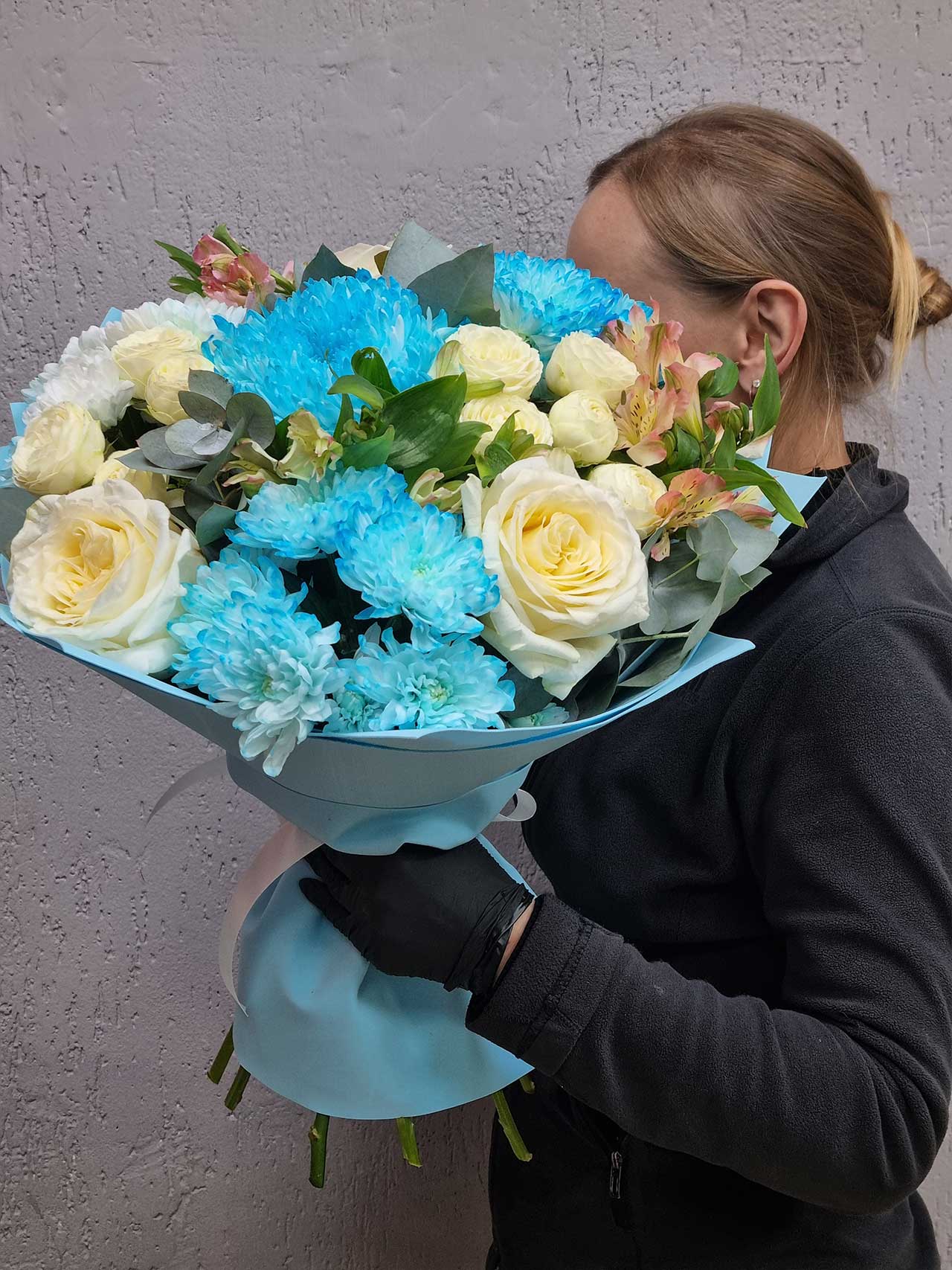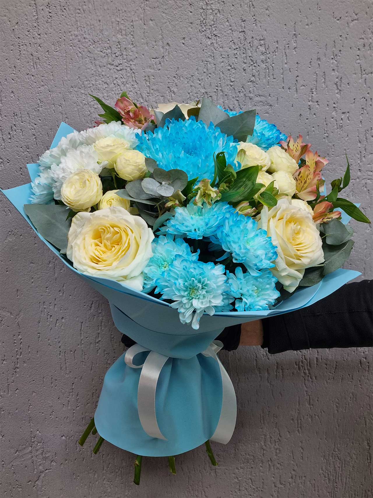 Каждый цветок в букете несет свою историю: розы — о страсти и нежности, альстромерии — о верности, а хризантемы — о радости и долголетии. Представьте себе, как вы дарите этот шедевр любимой женщине на день рождения или юбилей, наполняя атмосферу романтикой и теплом.