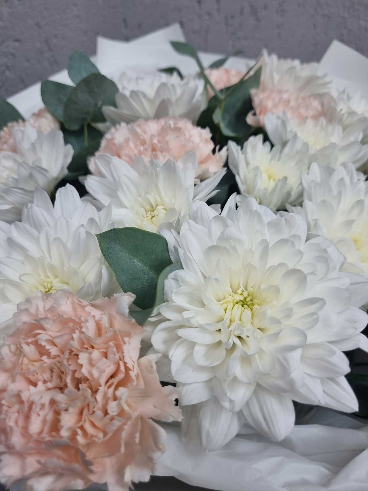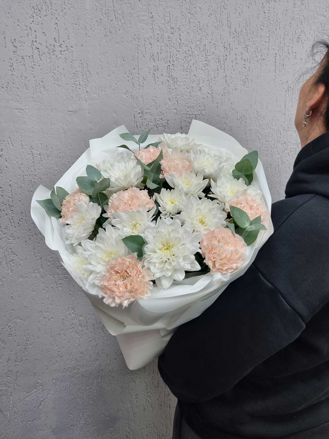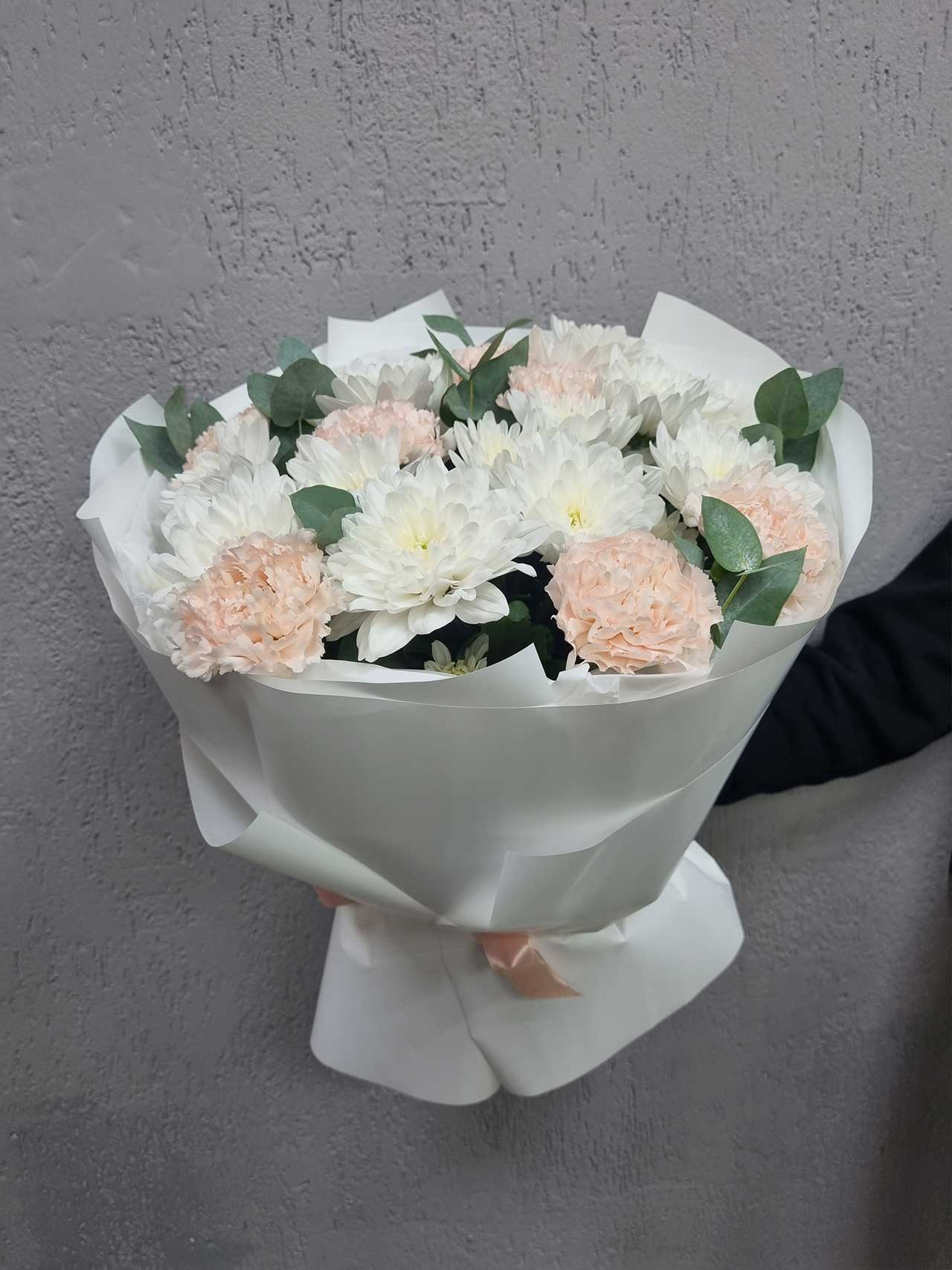 Представляем вашему вниманию букет «Сказочный Ветер» — изысканное сочетание кустовой хризантемы, одноголовой гвоздики и свежего эвкалипта. Это название символизирует легкость и нежность, словно легкий ветерок приносит с собой радость и тепло. Каждая деталь букета наполнена смыслом: хризантемы олицетворяют долгую дружбу и верность, гвоздики — преданность и любовь, а эвкалипт добавляет свежести и гармонии.
